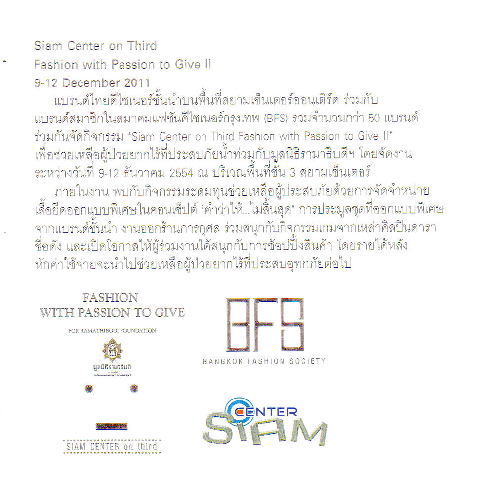 “Siam Center on Third Fashion with Passion to Give II” หารายได้สบทบมูลนิธิรามาธิบดีฯ เพื่อช่วยเหลือผู้ป่วยยากไร้ที่ประสบภัยน้ำท่วม